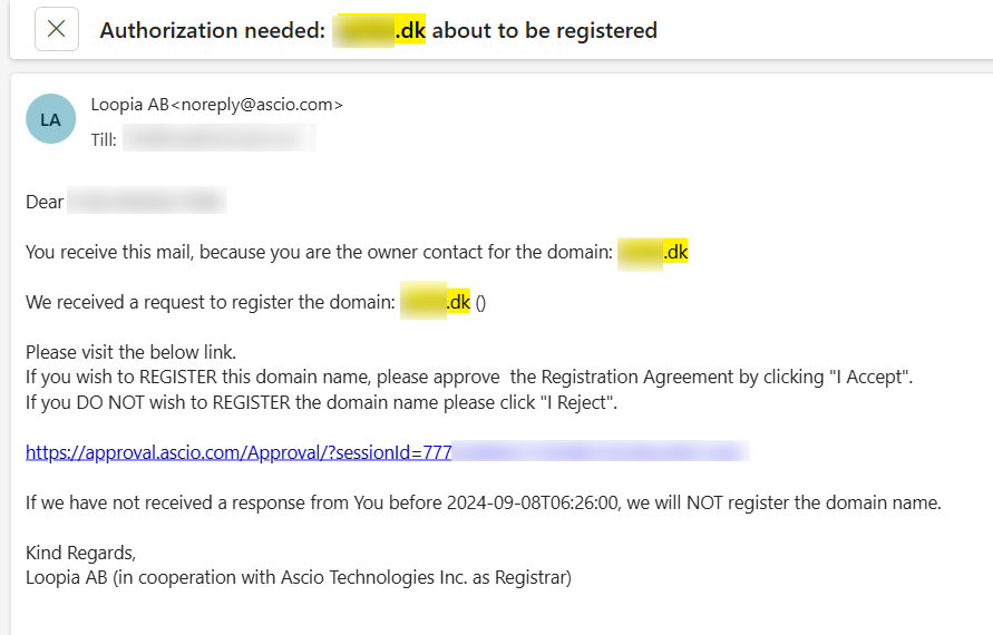 When you register a .DK domain name, you will get a message from Loopia AB noreply@ascio.com to accept the registration. It looks as follow: